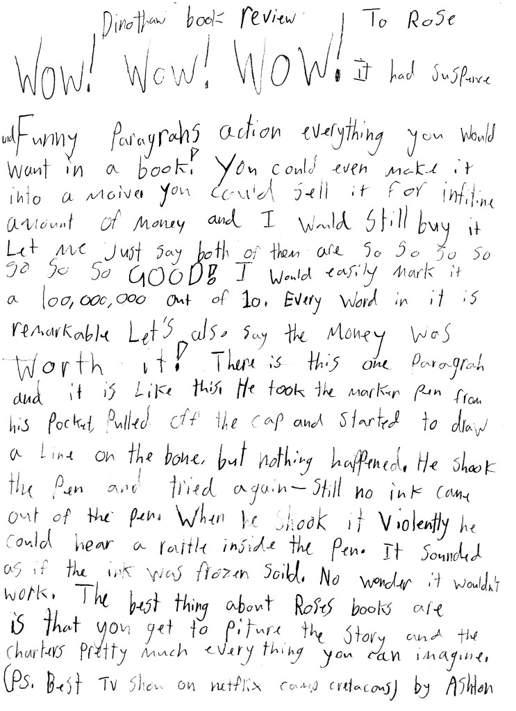Wow! Wow! Wow! It had suspense and funny paragraphs, action, everything you would want in a book! You could even make it into a movie… Let me just say both of these are so so so so GOOD! … There is this one paragraph and it is like this. He took the marker pen from his pocket, pulled off the cap and started to draw a line on the bone, but nothing happened. He shook the pen and tried again – still no ink came out of the pen. When he shook it violently he could hear the rattle inside the pen. It sounded if the ink was frozen solid….. The best thing about Rose’s books are that you get the picture, the story and the characters. Pretty much everything you can imagine…